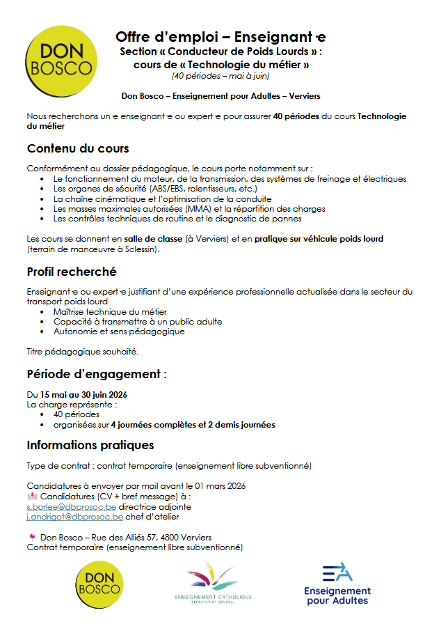 Renseignements / inscriptionsNotre établissement recherche un·e enseignant·e motivé·e et engagé·e pour assurer un cours de Technologie du métier dans la section Conducteur Poids Lourds.